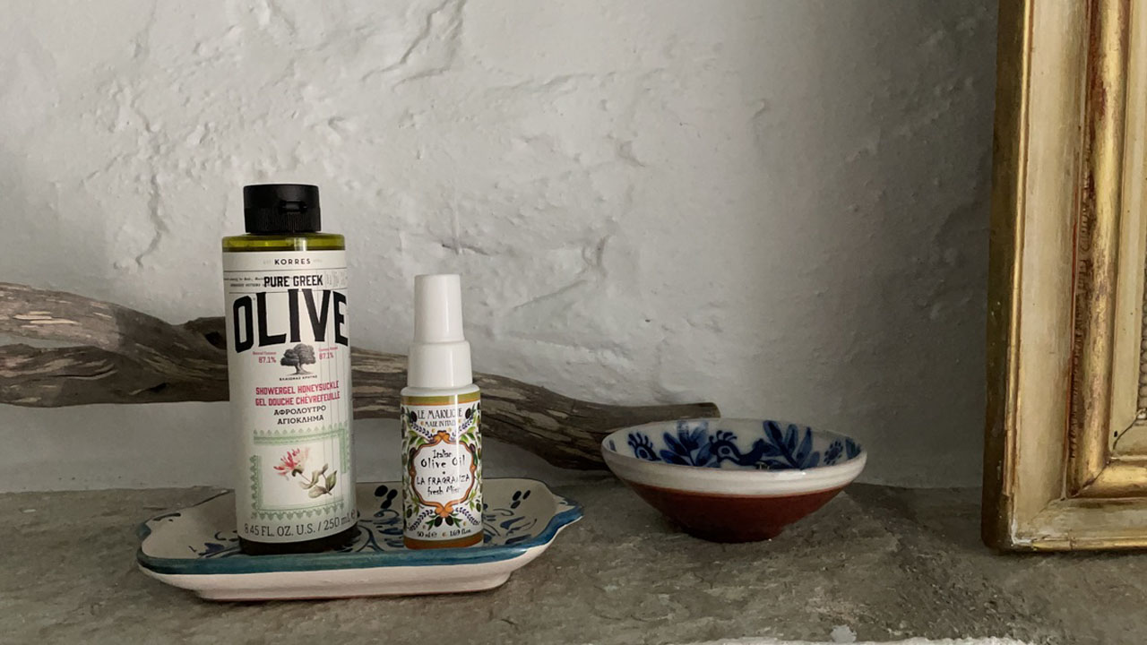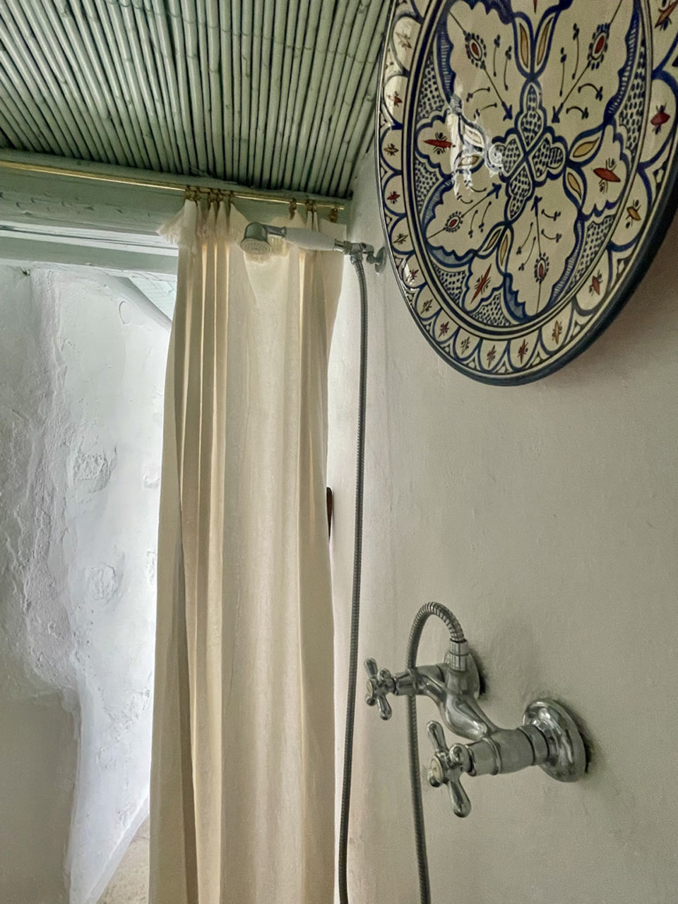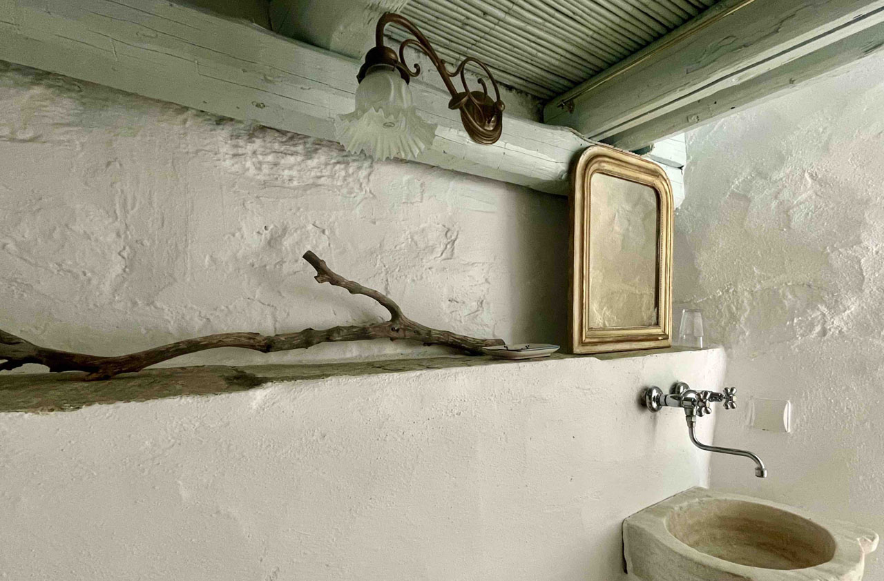The large bathroom with an old marble washbasin and an antique mirror is fascinating and comfortable. The bathroom is separated from the room with a natural fabric curtain.