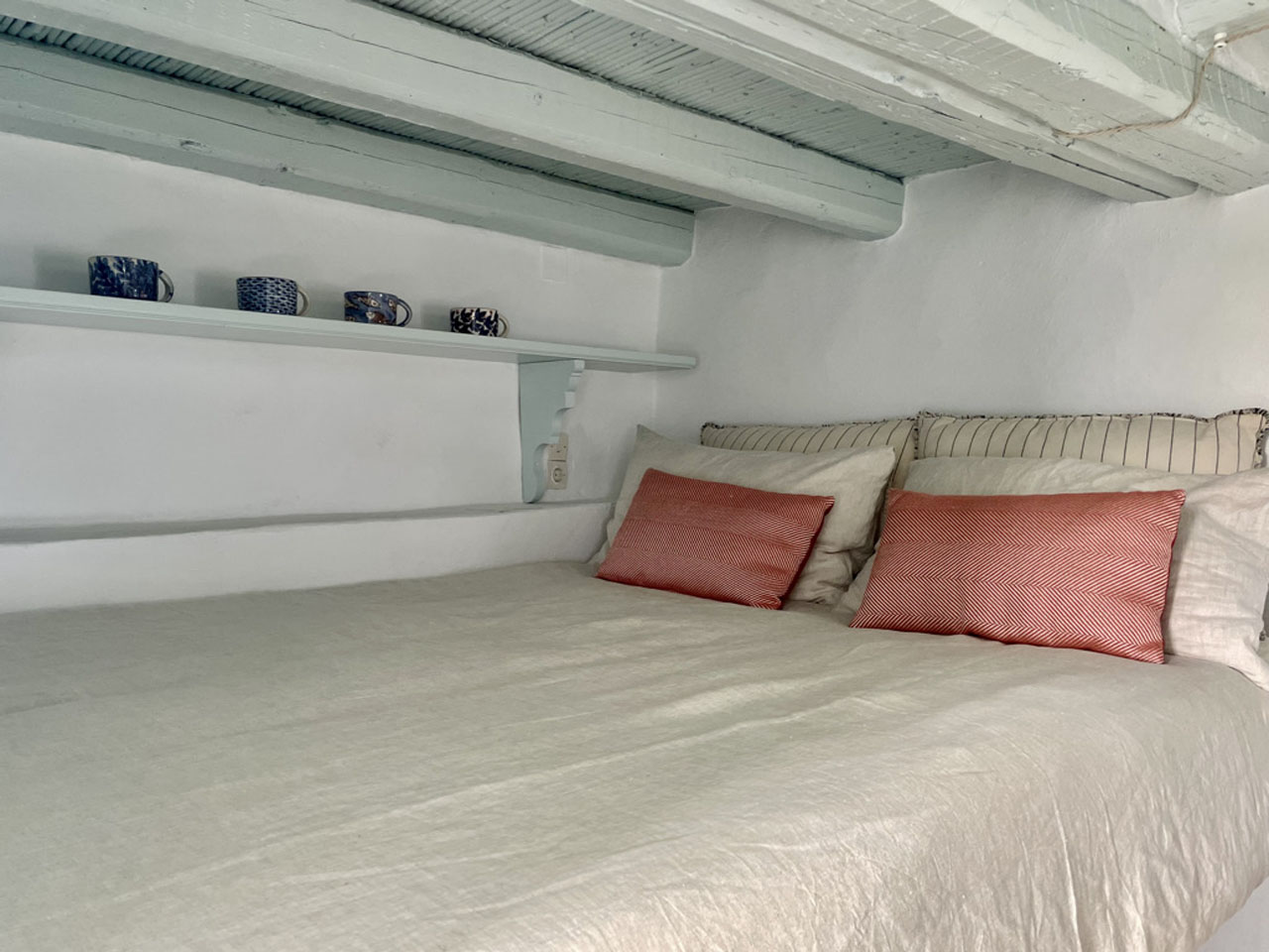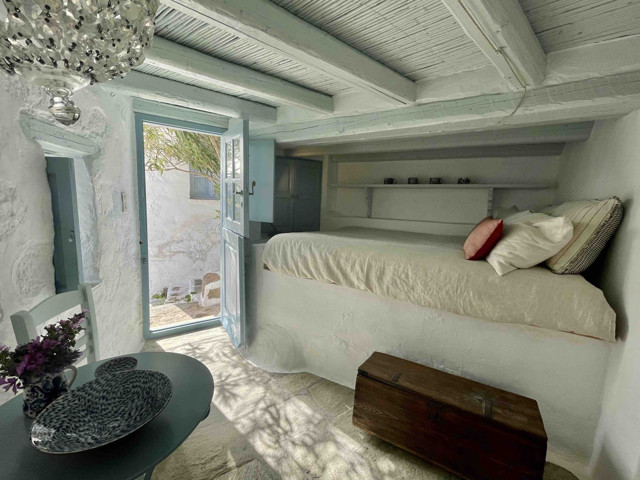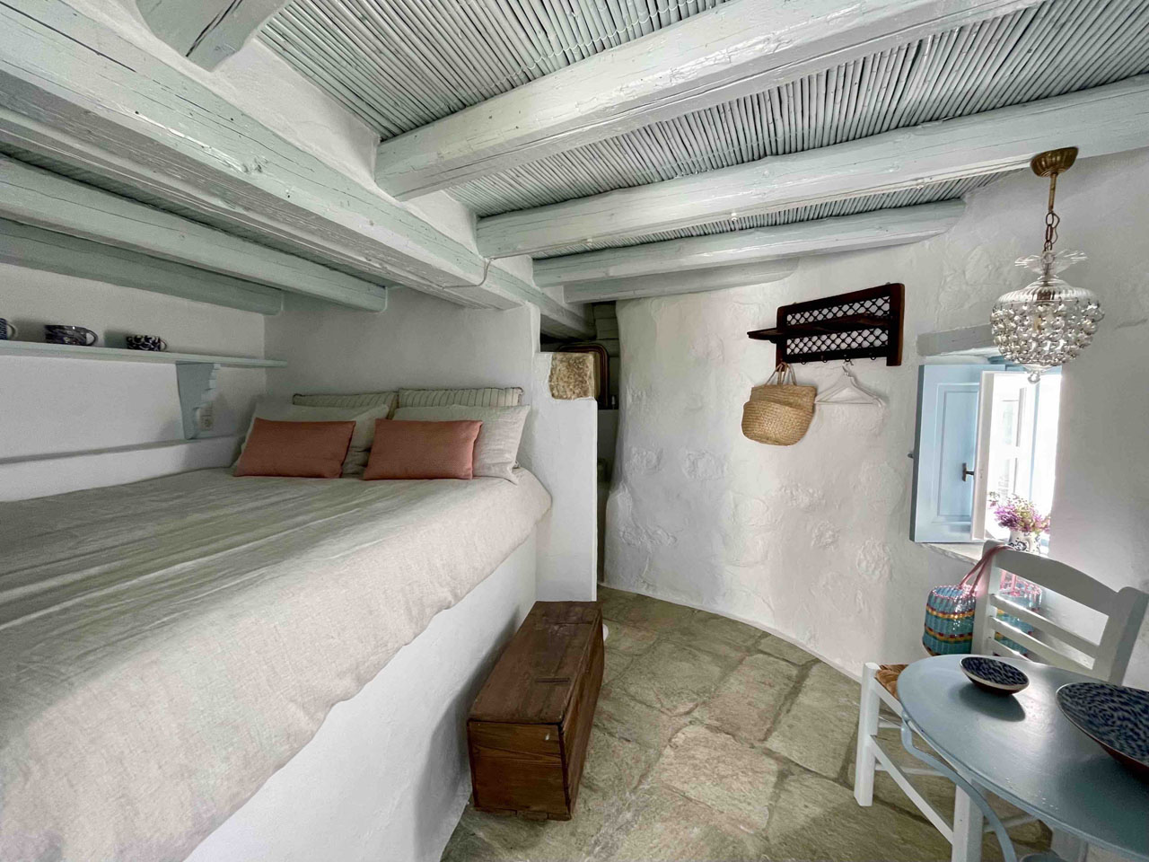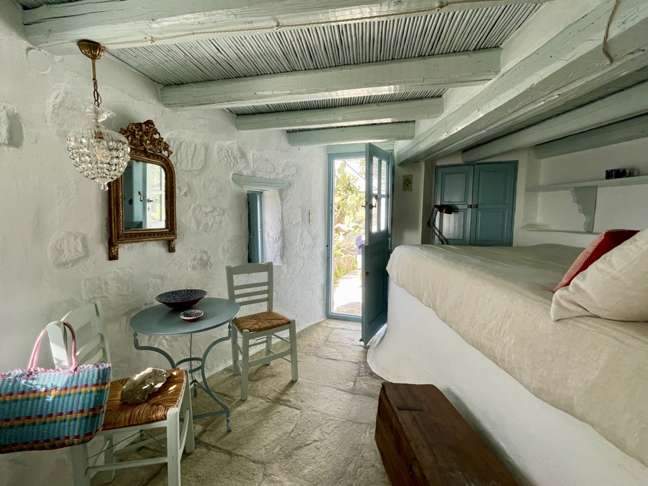 The bed is a comfortable traditional alcove with linen bed sheets. The room and the bathroom are furnished with antiques to recreate the warm and original atmosphere of the old houses of Chora with a touch of the Italian style of its owners. The bamboo, grown on the island, is used for ceilings according to the Serifos tradition.