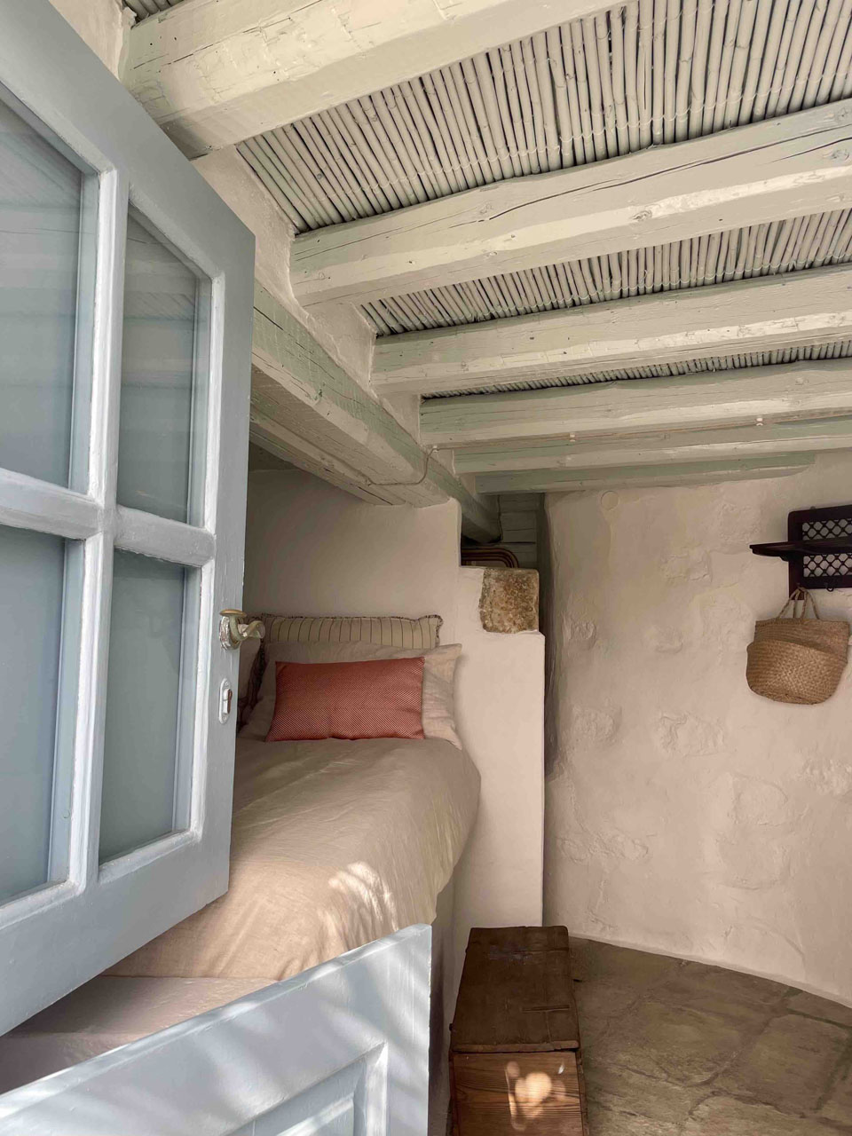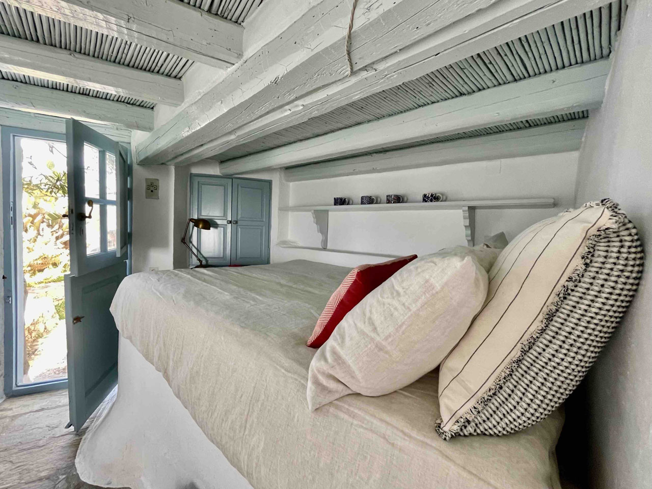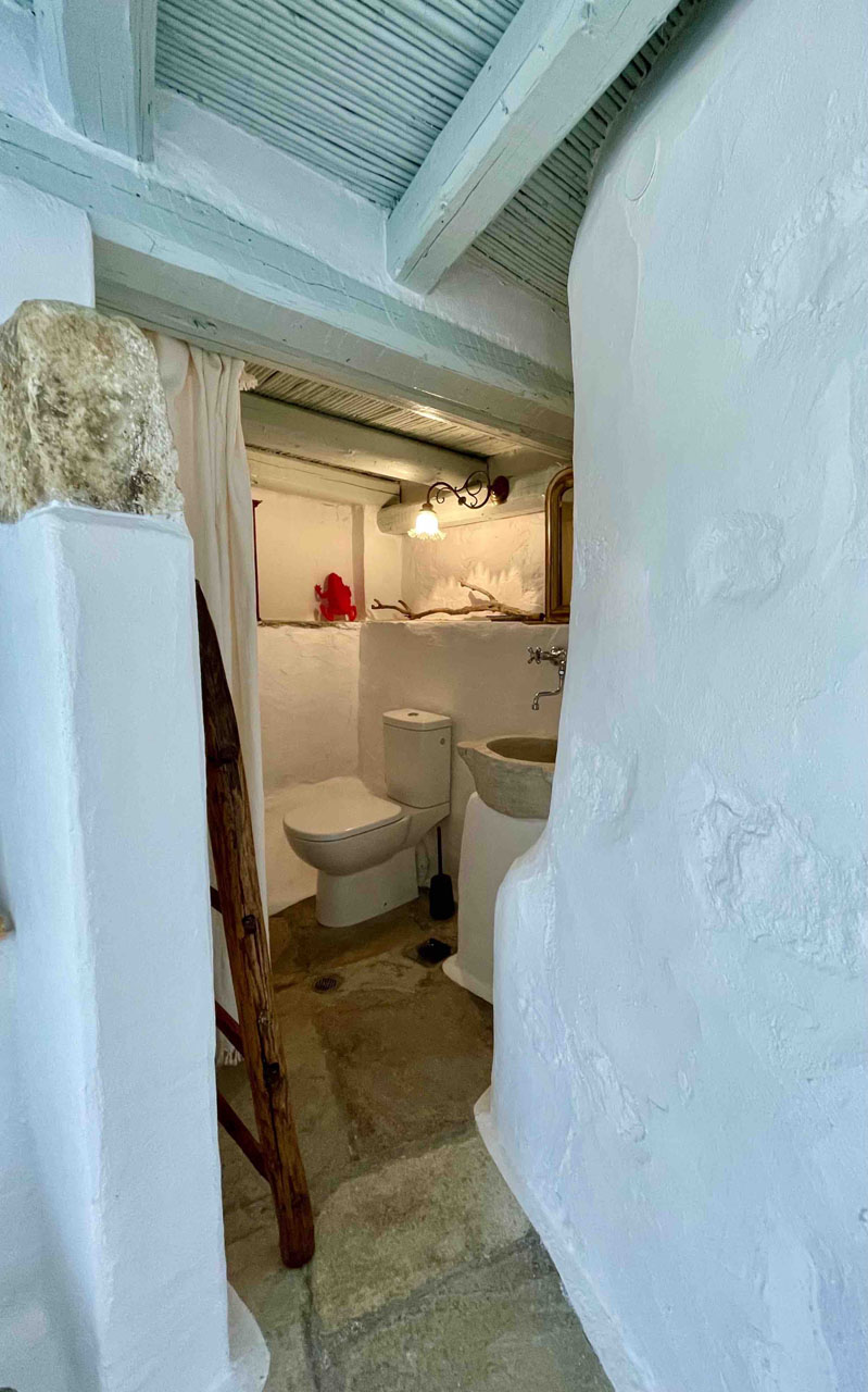 The bed is a comfortable traditional alcove with linen bed sheets. The room and the bathroom are furnished with antiques to recreate the warm and original atmosphere of the old houses of Chora with a touch of the Italian style of its owners. The bamboo, grown on the island, is used for ceilings according to the Serifos tradition.